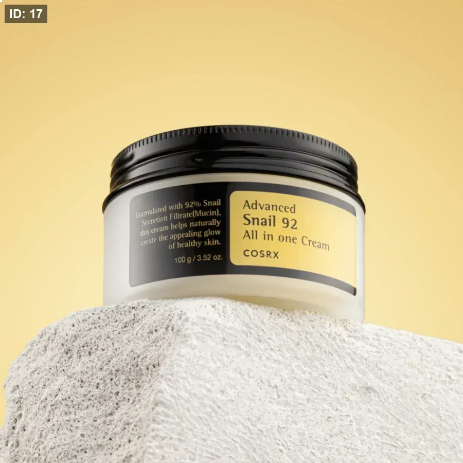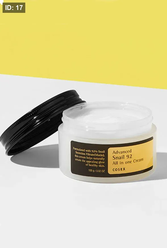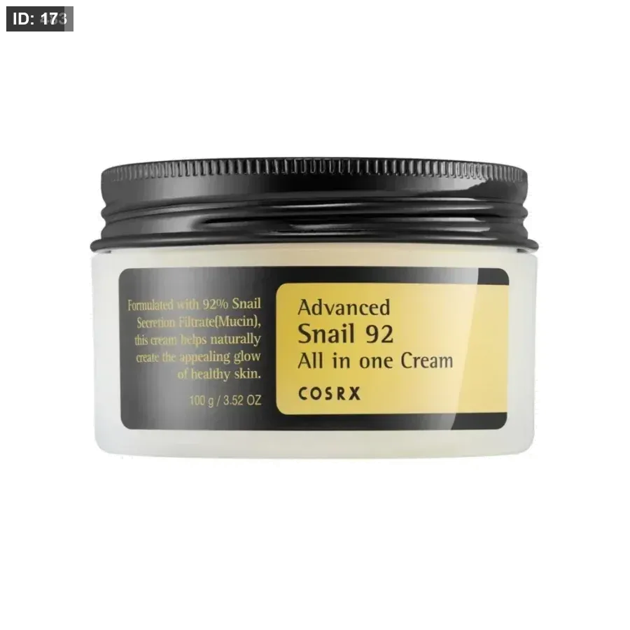 - كريم Advanced Snail 92 All In One Cream من COSRX هو تركيبة مغذية ومُجددة للبشرة تحتوي على 92٪ من إفراز الحلزون الطبيعي (Snail Mucin)، الذي يعمل على ترميم وتجديد خلايا البشرة بعمق.