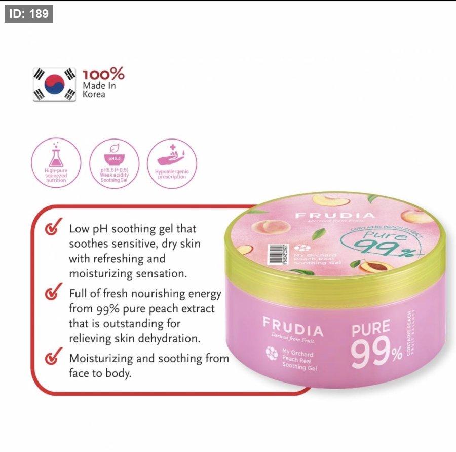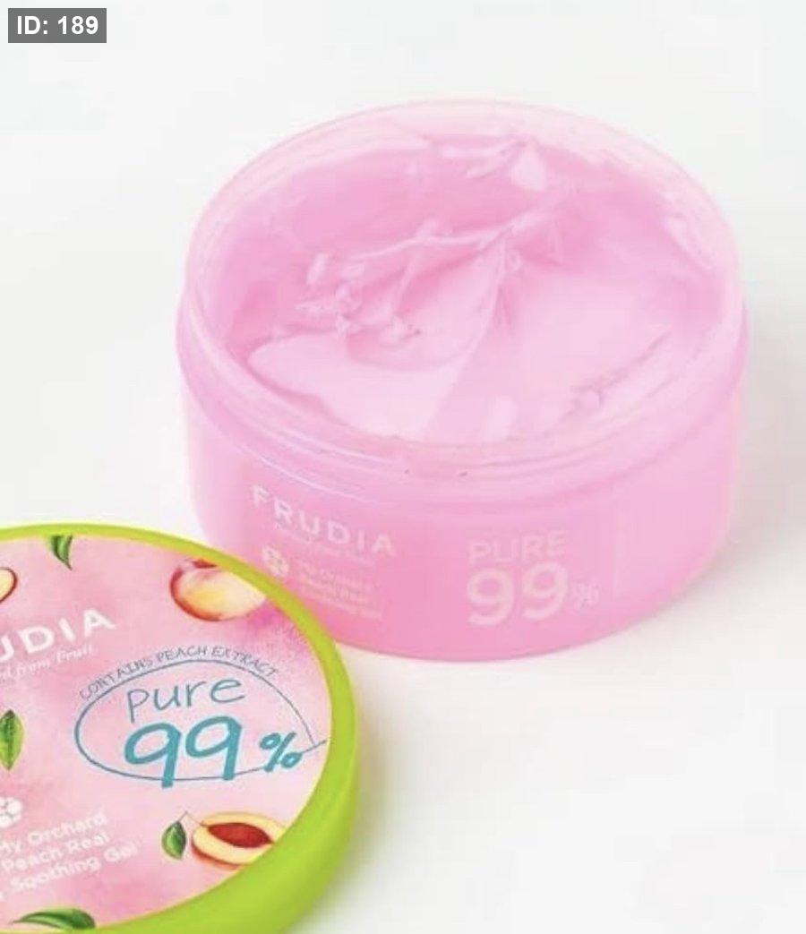 - دلّلي بشرتك مع جل Frudia Peach Soothing Gel 99% — لمسة ناعمة من الطبيعة تجمع بين خلاصة الخوخ الغني بالفيتامينات والألوفيرا المرطّبة بعمق، لتمنح بشرتك راحة فورية وترطيباً مكثّفاً يدوم طوال اليوم 🍑✨