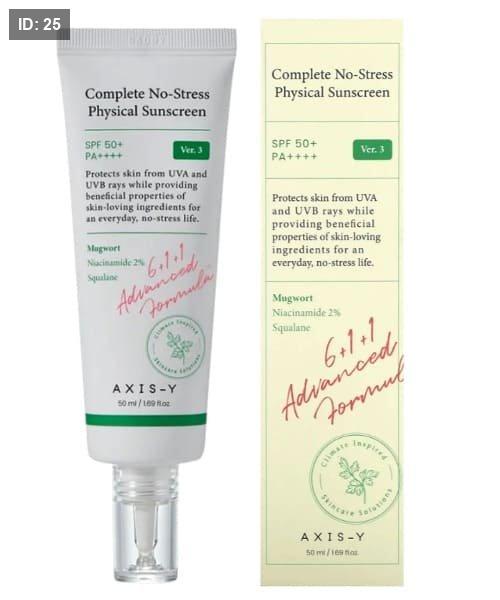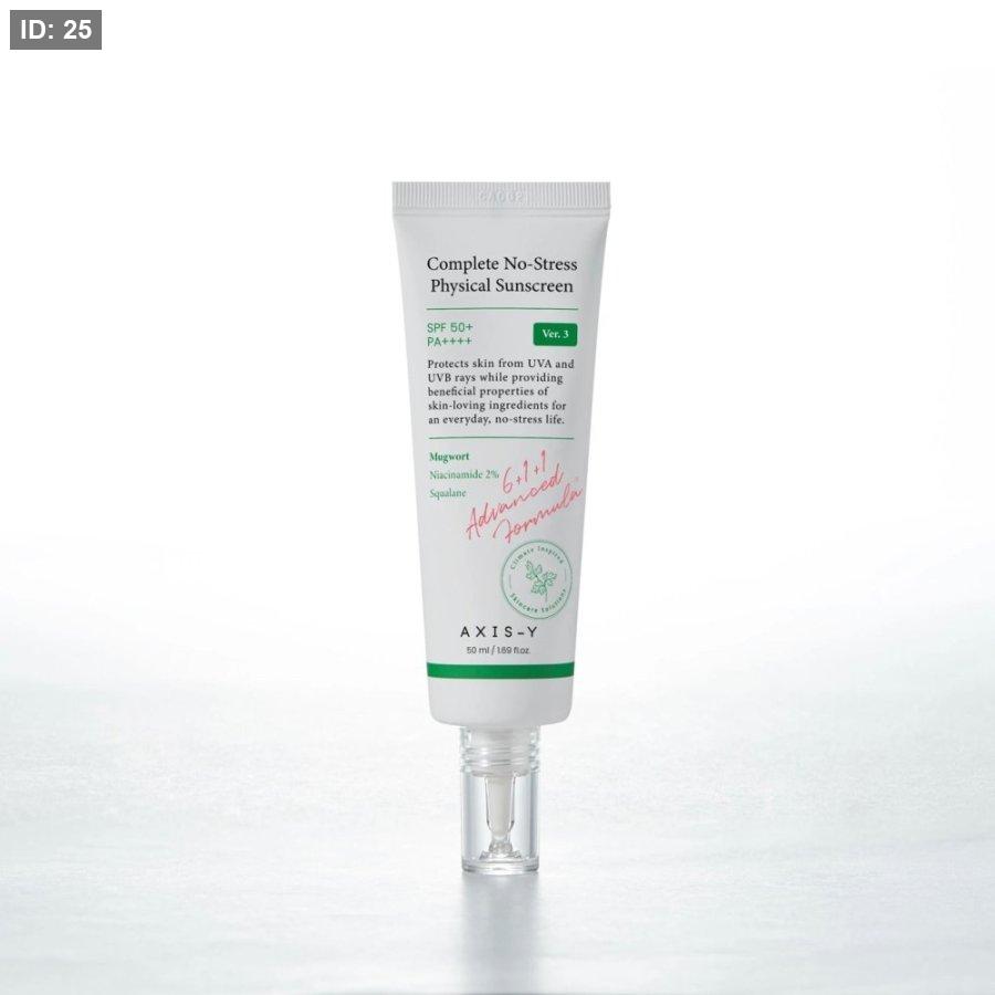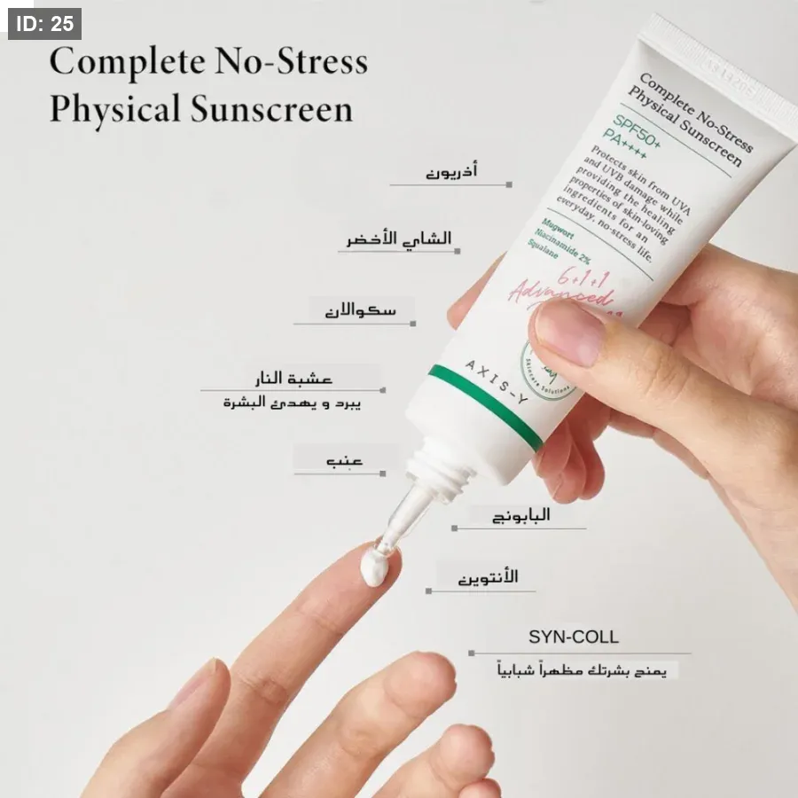 - واقي الشمس Complete No-Stress Physical Sunscreen من AXIS-Y هو حماية يومية متقدمة تجمع بين العناية والترطيب والتهدئة في منتج واحد.