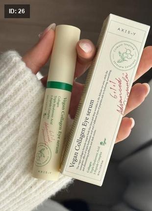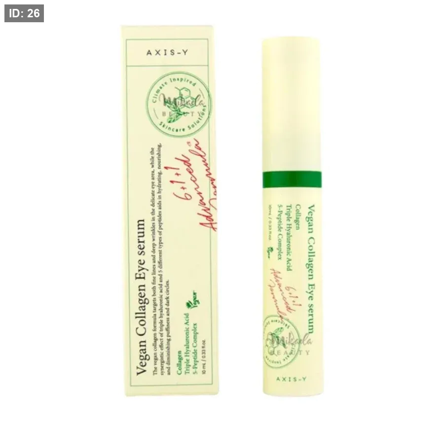 - سيروم العين النباتي Vegan Collagen Eye Serum من AXIS-Y هو علاج متكامل لمنطقة العين الحساسة يمنحها الترطيب، الشدّ، والإشراق الطبيعي.