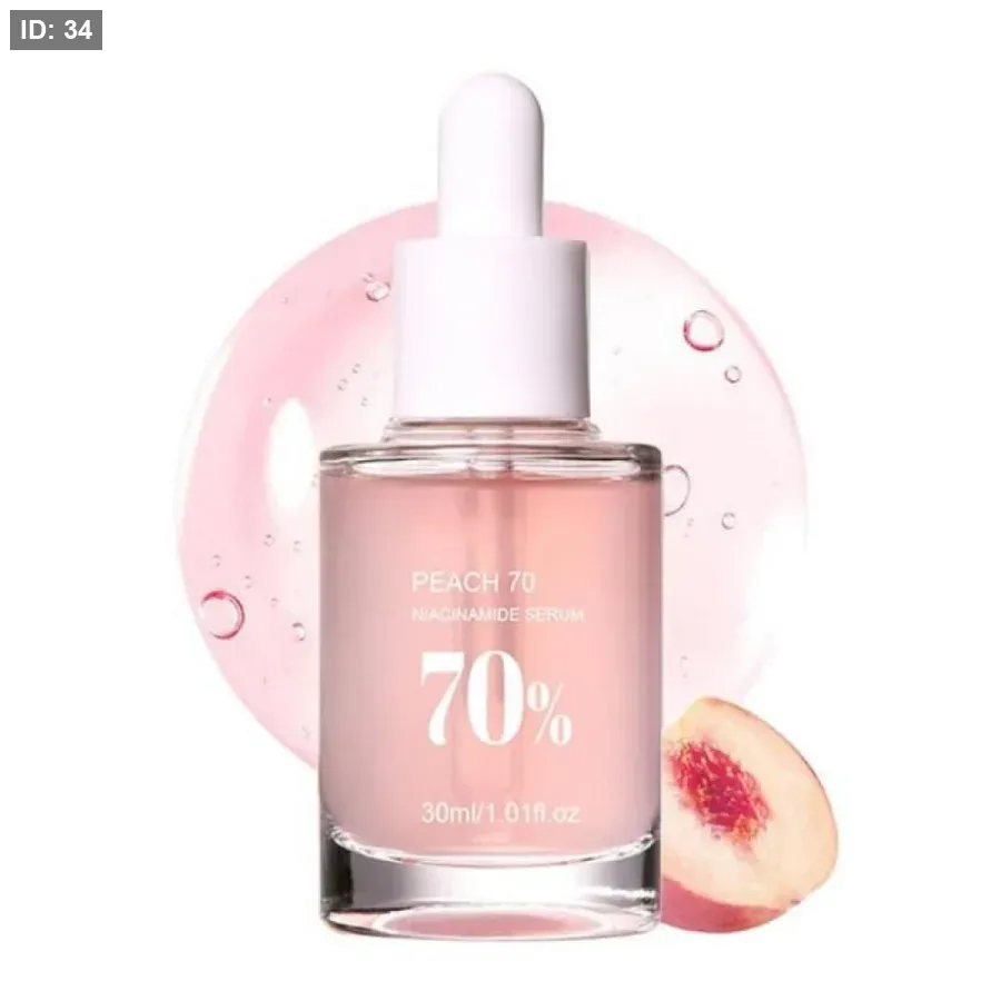 - سيروم Peach 70 Niacinamide Serum هو مزيج فاخر من 70٪ من مستخلص الخوخ الطبيعي والنياسيناميد (فيتامين B3)، يمنح بشرتك إشراقة فورية ولمعانًا طبيعيًا متوهجًا.