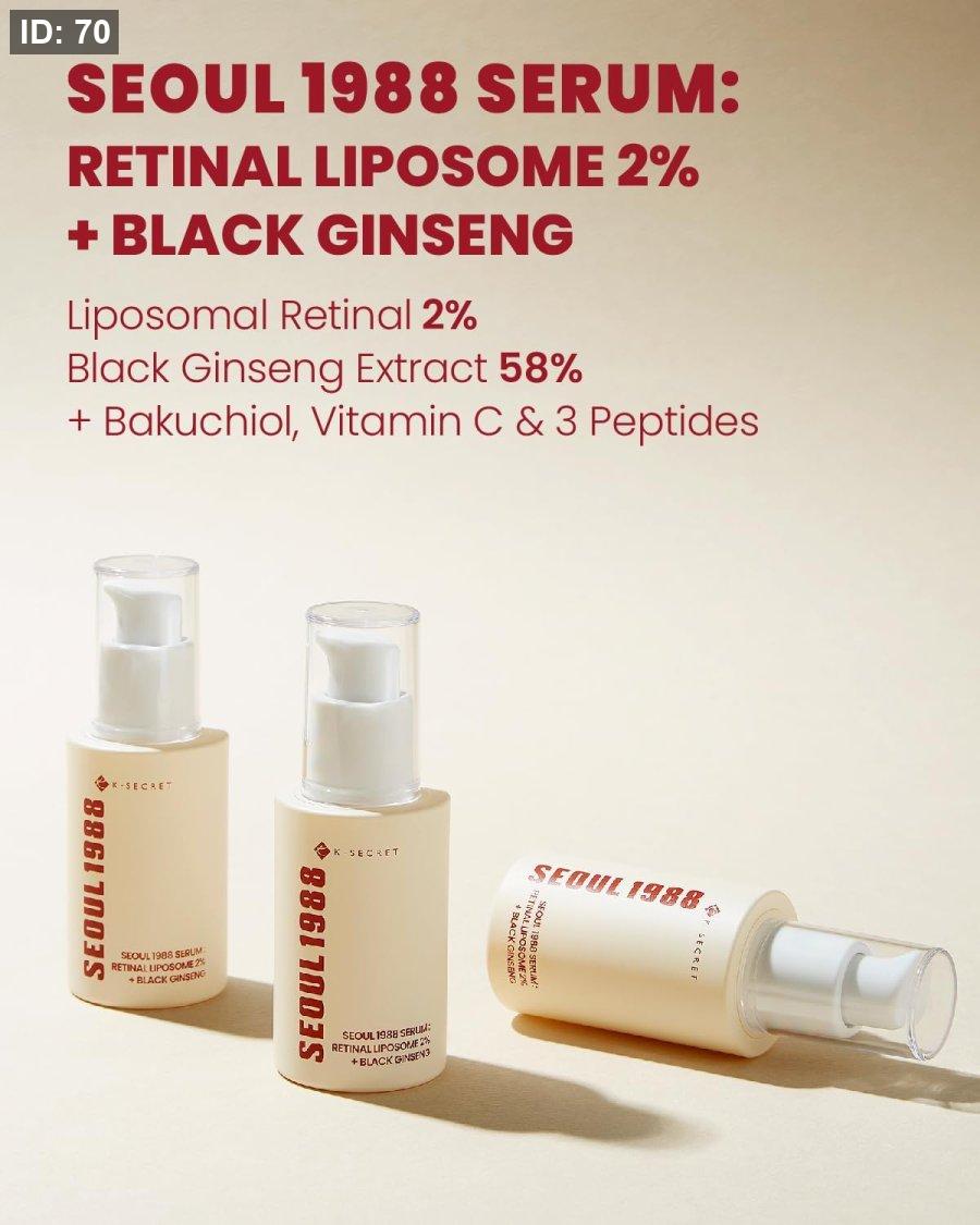 - ُيعد K-Secret Seoul 1988 Retinal Serum علاجًا متطورًا لمكافحة علامات التقدّم في السن واستعادة إشراقة البشرة الطبيعية. يجمع بين قوة الريتينال الليبوسومي بتركيز 2% المعروف بقدرته على تجديد الخلايا وتعزيز إنتاج الكولاجين، ومستخلص الجينسنغ الأسود بنسبة 58% الذي يغذي البشرة بعمق ويحسّن مرونتها ويمنحها حيوية واضحة.