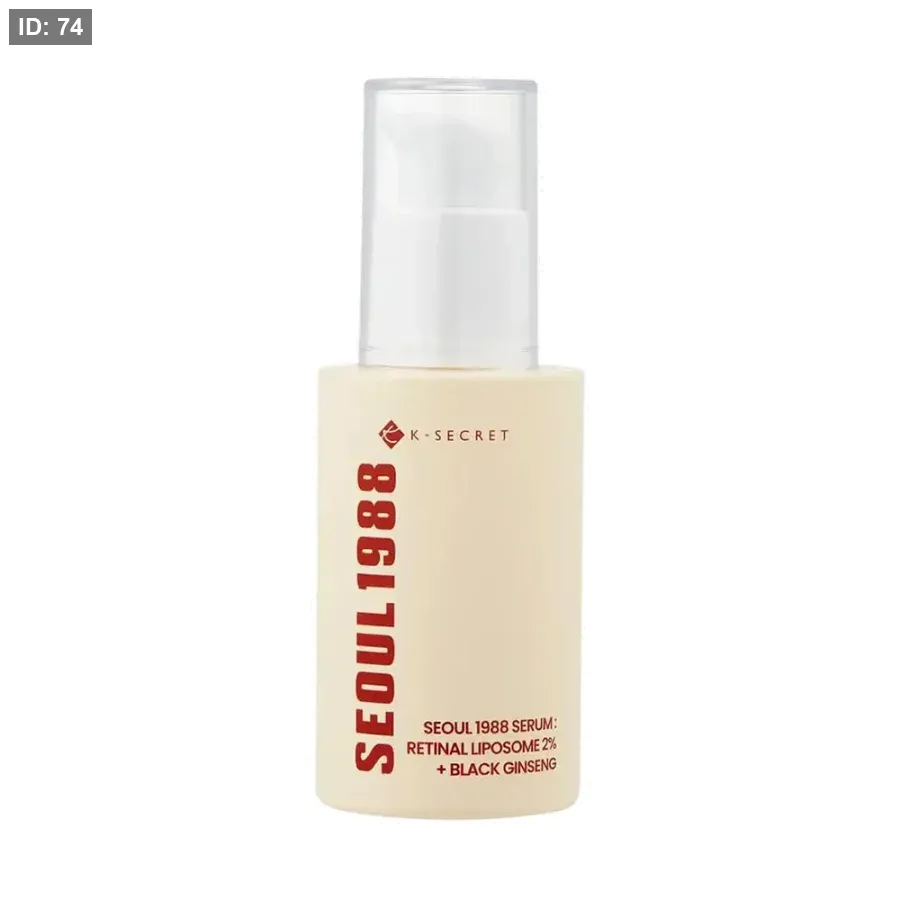 - سيروم K-Secret Seoul 1988 Retinal Liposome 2% + Black Ginseng هو سيروم فائق الفعالية مصمم لتجديد البشرة ومنحها مظهرًا أكثر شبابًا وحيوية. يحتوي على ريتينال ليبوزومي بتركيز 2% المعروف بقدرته على تعزيز تجديد خلايا البشرة وتحفيز إنتاج الكولاجين، مما يساعد في تقليل الخطوط الدقيقة والتجاعيد بوضوح.